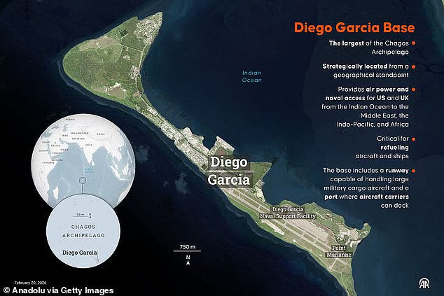 · Iran fired two intermediate-range ballistic missiles at Diego Garcia — the joint U.S.-U.K. Indian Ocean base housing B-2 bombers, approximately 4,000 kilometers from Iran — hours after the U.K. authorized U.S. use of British bases for Hormuz strikes; one missile failed in flight, a U.S. warship fired an SM-3 interceptor at the second; the U.K. MoD confirmed the attack was “unsuccessful” and directly linked it to the basing authorization. [24]