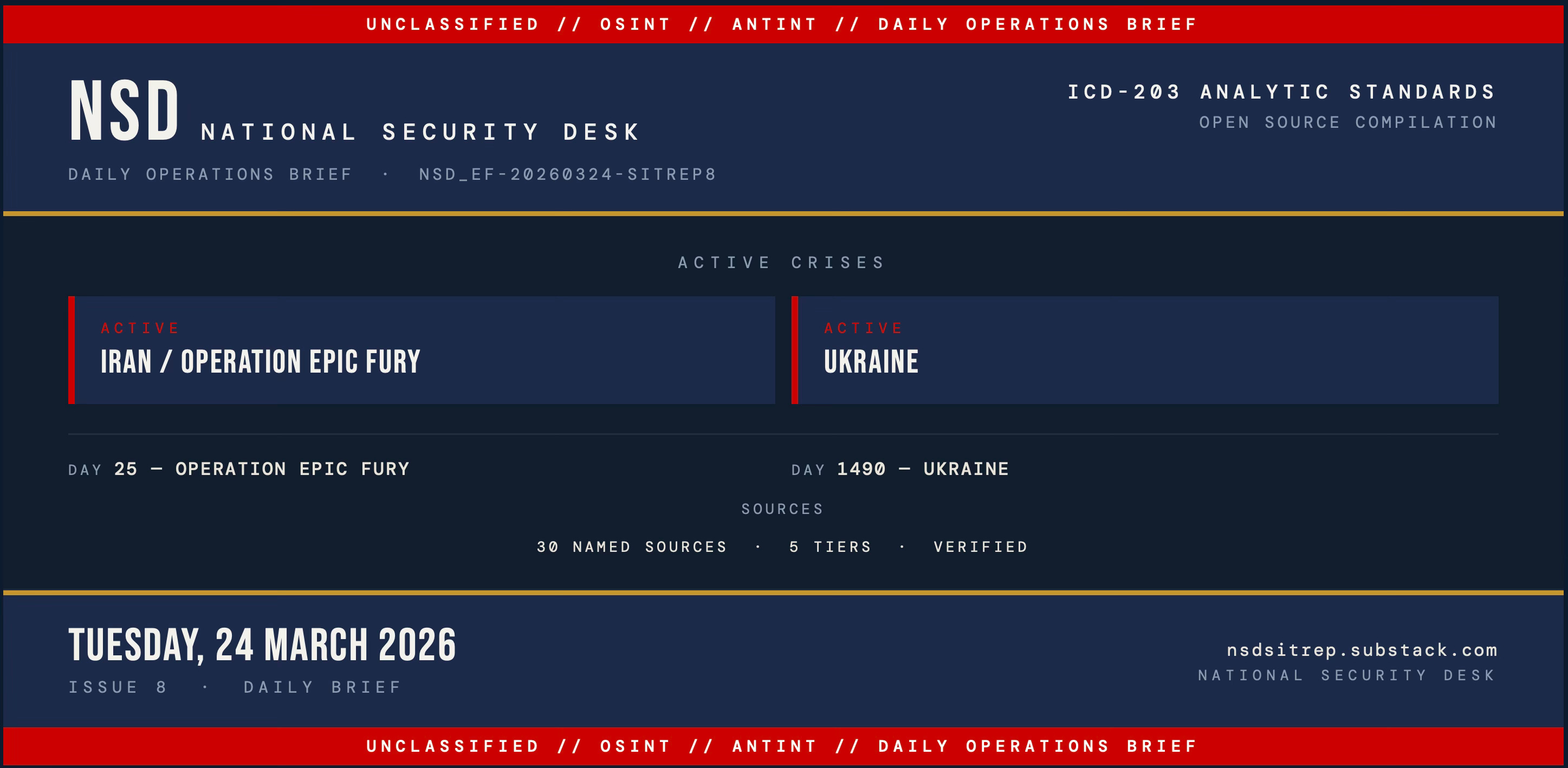NSD SITREP is published by the National Security Desk. All sources open-source. ICD-203 analytic standards applied throughout.